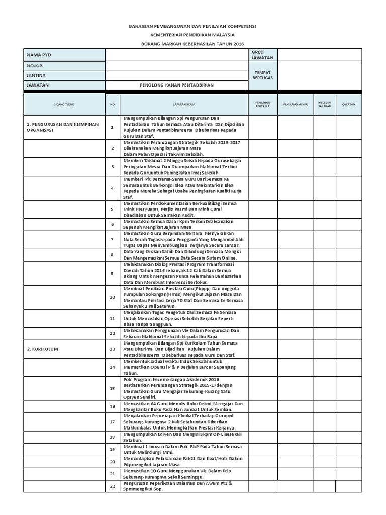 Borang keberhasilan pk pentadbiran 2020. Bilangan sasaran ataupun minimun sasaran yang ditetapkan adalah berbeza mengikut pentadbiran sekolah dan pejabat pendidikan daerah. BAHAGIAN PEMBANGUNAN DAN PENILAIAN KOMPETENSI KEMENTERIAN PENDIDIKAN MALAYSIA BORANG MARKAH KEBERHASILAN TAHUN 2016 GRED NAMA PYD RAJESWARY AP RAMAN JAWATA DG41 N NOKP. Untuk maaklumat lanjut tentang contoh borang keberhasilan guru atau sebarang perkara berkaitan anda boleh hubungi.