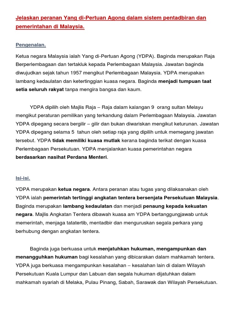 Peranan ydpa dalam sistem pentadbiran. Masyarakat dan pihak kerajaan Malaysia adalah disarankan agar mempergiatkan lagi usaha mereka dalam menerapkan sistem pengurusan dan pentadbiran yang berlandaskan Islam ini agar ia dapat memberikan manfaat dan membimbing masyarakat ke jalan yang benar. Bincangkan peranan dan kedudukan Yang di-Pertuan Agong YDPA dalam sistem kerajaan Persekutuan Malaysia. Baginda mempunyai kuasa tertinggi dalam.