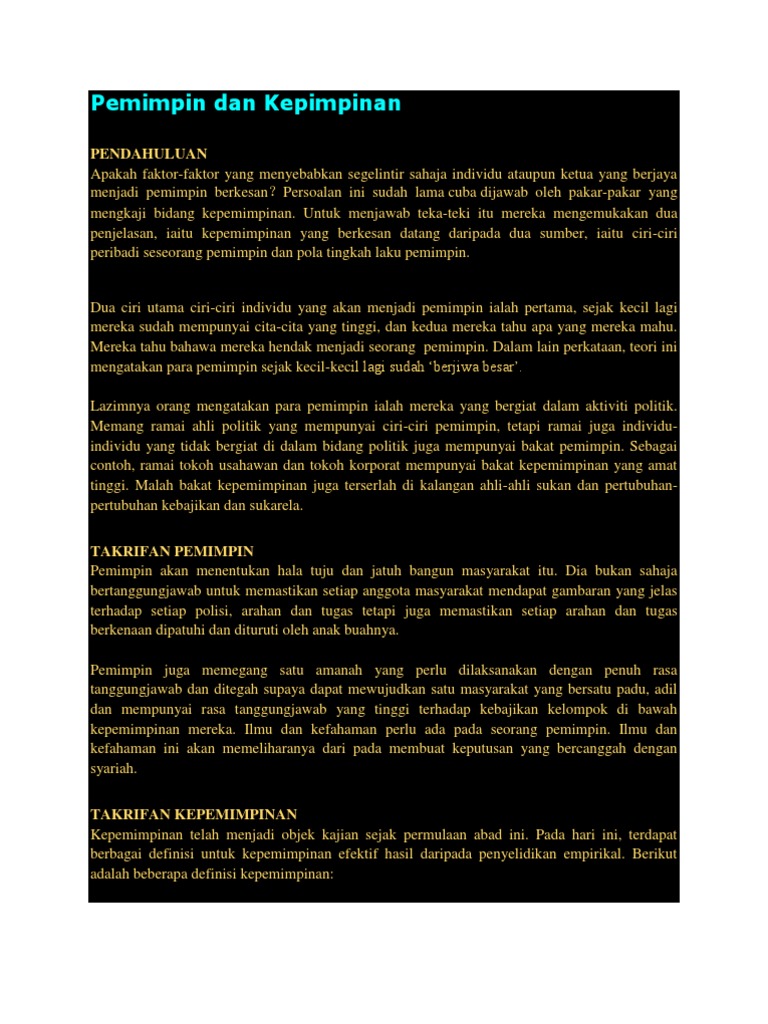 Melibatkan keupayaan kebolehan kebijaksanaan seseorang untuk memerintah mengarah mendorong atau mempengaruhi3 Menurut definisi pemimpin dan kepimpinan ini dapat diringkaskan bahawa pemimpin ialah penghulu manakala kepimpinan pula ialah mutu fenomena proses seseorang penghulu dalam sesebuah organisasi dengan mewujudkan hubungan pemimpin dan pengikut bagi mencapai kecemerlangan dalam. Pembangunan insan hendaklah disemarakkanlagi bagi membentuk Insan-insan Rabbani yang progresif cergas dan tangkas. Rakyat bebas bersuara untuk.