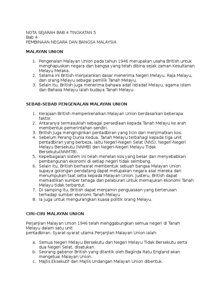 PEMBINAAN NEGARA DAN BANGSA MALAYSIA 41 Malayan Union 411 Sebab-Sebab Pengenalan Malayan Union 412 Ciri-Ciri Perjanjian Malayan Union 1946 413 Reaksi Terhadap Malayan Union. Dikuasai oleh sebuah pemerintah pusat yang kuat. Berikut dikongsikan Nota Ringkas Sejarah Tingkatan 5 SPM bagi Bab 4 yang berjudul Pembinaan Negara dan Bangsa Malaysia untuk panduan pelajar semua.