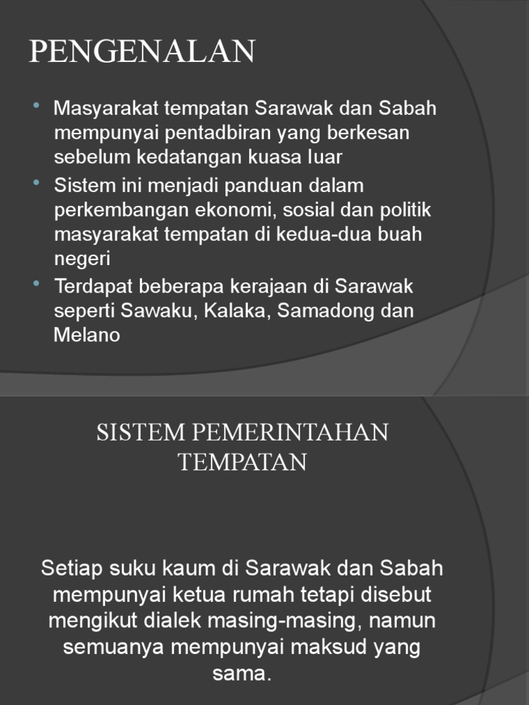 Perubahan Pentadbiran Ke Arah Berkerajaan Sendiri di Sarawak. Walau bagaimanapun sistem pemerintahan tradisional masih diteruskan. A menerangkan perubahan pentadbiran di Negeri-negeri Melayu Sabah dan Sarawak.